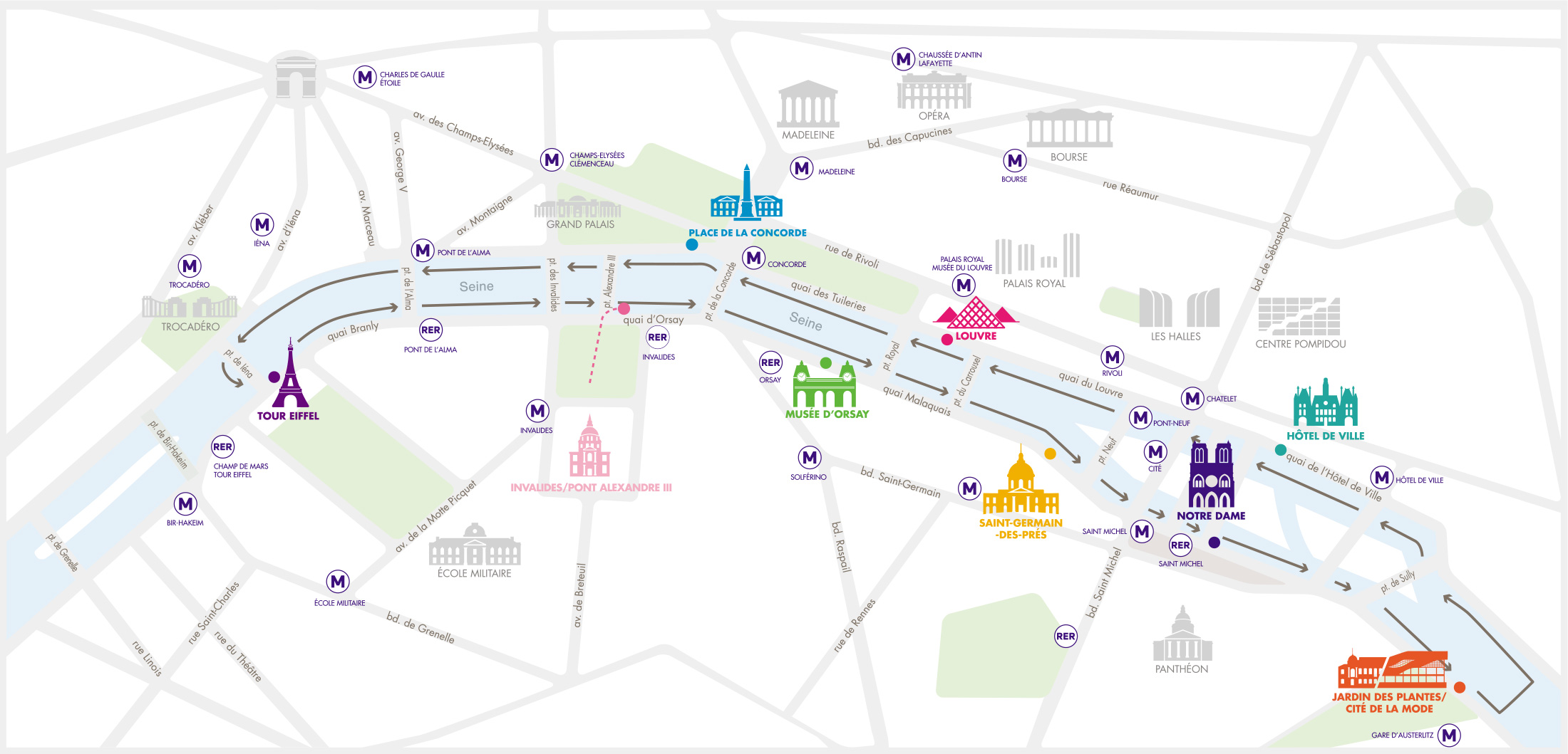 ## Meet-up information **Eiffel Tower** - Address: Port de la Bourdonnais - Please refer to the map for assistance **Musée d'Orsay** - Address: Quai de Solférino - Please refer to the map for assistance **Notre-Dame** - Address: Quai de Montebello 5 - Please refer to the map for assistance **Hôtel de Ville** - Address: Quai de l'Hôtel de Ville - Please refer to the map for assistance **The Place of Concorde** - Address: Port des Champs-Elysées - Please refer to the map for assistance