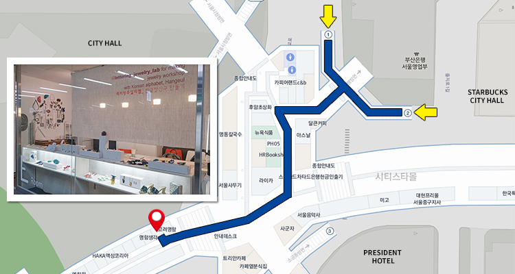 - Get off at City Hall Station (Subway Line 1, Exit5) or Euljiro-1ga Station (Subway Line 2, Exit8) - Move to President Hotel - Use the entrance No. 3(EXIT3) in front of the President Hotel to go down to the underground shopping mall (different from exit 3 of City Hall Station or Euljiro-1ga Station. Stairs to entrance No. 3 leading to the CitiStar Mall, underground shopping mall) Get off at City Hall Station (Subway Line 1, Exit5) or Euljiro-1ga Station (Subway Line 2, Exit8) - Move to President Hotel - Use the entrance No. 3(EXIT3) in front of the President Hotel to go down to the underground shopping mall (different from exit 3 of City Hall Station or Euljiro-1ga Station. Stairs to entrance No. 3 leading to the CitiStar Mall, underground shopping mall) !Get off at City Hall Station (Subway Line 1, Exit5) or Euljiro-1ga Station (Subway Line 2, Exit8) - Move to President Hotel - Use the entrance No. 3(EXIT3) in front of the President Hotel to go down to the underground shopping mall (different from exit 3 of City Hall Station or Euljiro-1ga Station. Stairs to entrance No. 3 leading to the CitiStar Mall, underground shopping mall) - Face the shoe store - Go down the left stairs - The third shop on the left (Lettering Jewelry Lab, 12 Eulji-ro, Jung-gu, Seoul, Saetuk 4-5 in CityHall Plaza underground shopping center). Face the shoe store - Go down the left stairs - The third shop on the left (Lettering Jewelry Lab, 12 Eulji-ro, Jung-gu, Seoul, Saetuk 4-5 in CityHall Plaza underground shopping center). !Face the shoe store - Go down the left stairs - The third shop on the left (Lettering Jewelry Lab, 12 Eulji-ro, Jung-gu, Seoul, Saetuk 4-5 in CityHall Plaza underground shopping center).