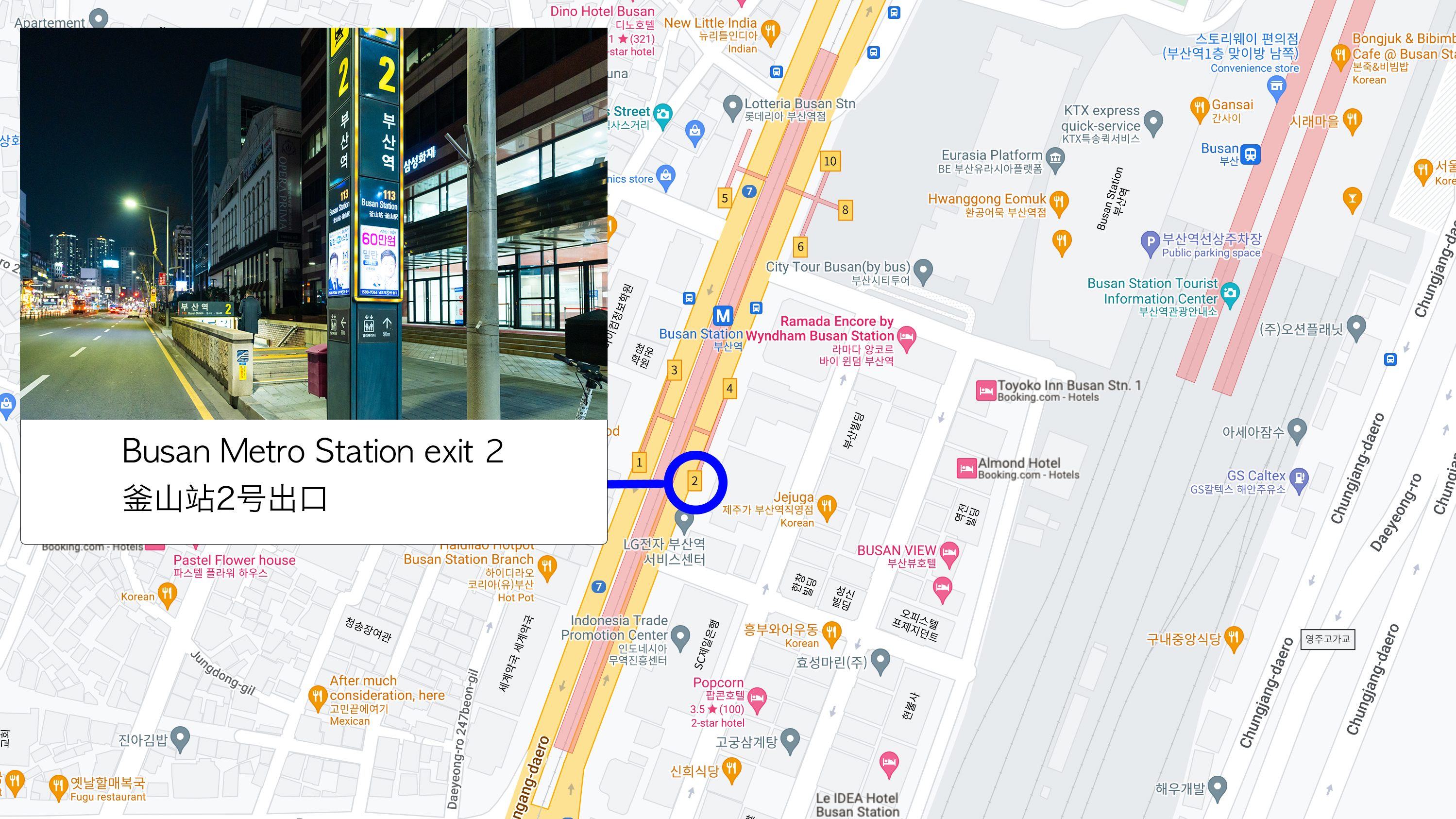 ## Meet-up information **Busan Subway Station Subway Exit 2** - Address: 184, Jungang-daero, Dong-gu, Busan, Republic of Korea